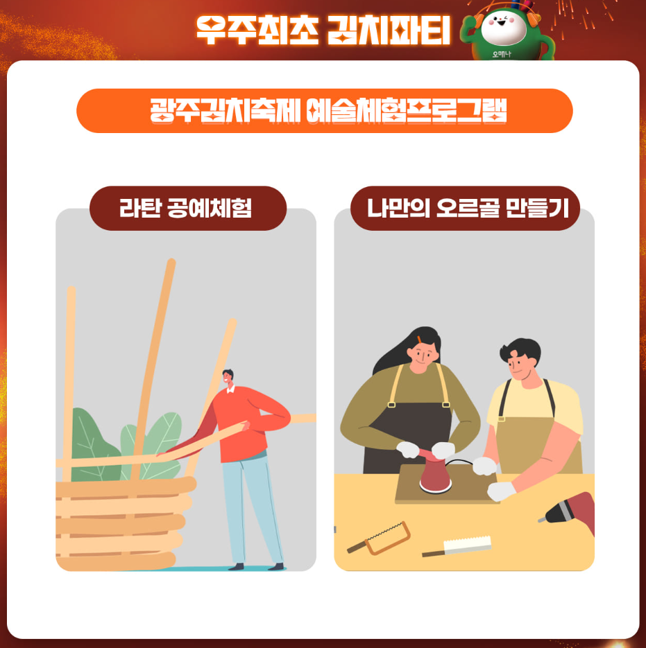 사전행사로는 프리오픈 이벤트 맛있는 김치파티가 열립니다. 2023.10.30(일) 12:30분에 광주김치축제 대표 프로그램을 소개하는 프로그램입니다.