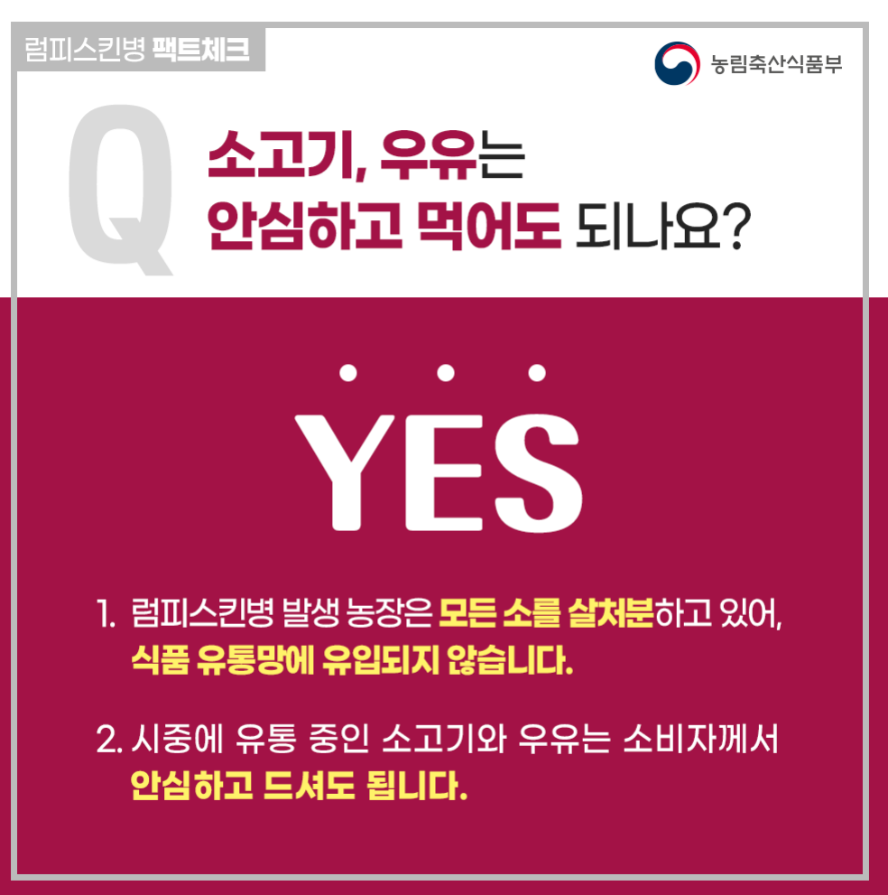 럼피스킨병 증상 발생농장에 모든 소는 살처분이 됩니다. 그로 인해 시중에 유통 중인 소고기와 우유는 소비자께서 안심하고 드셔도 됩니다.