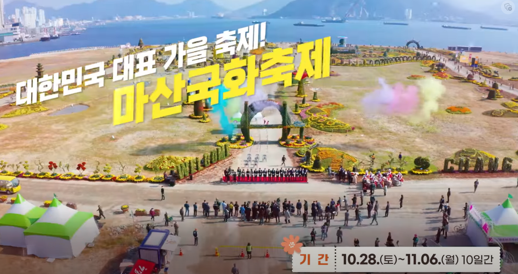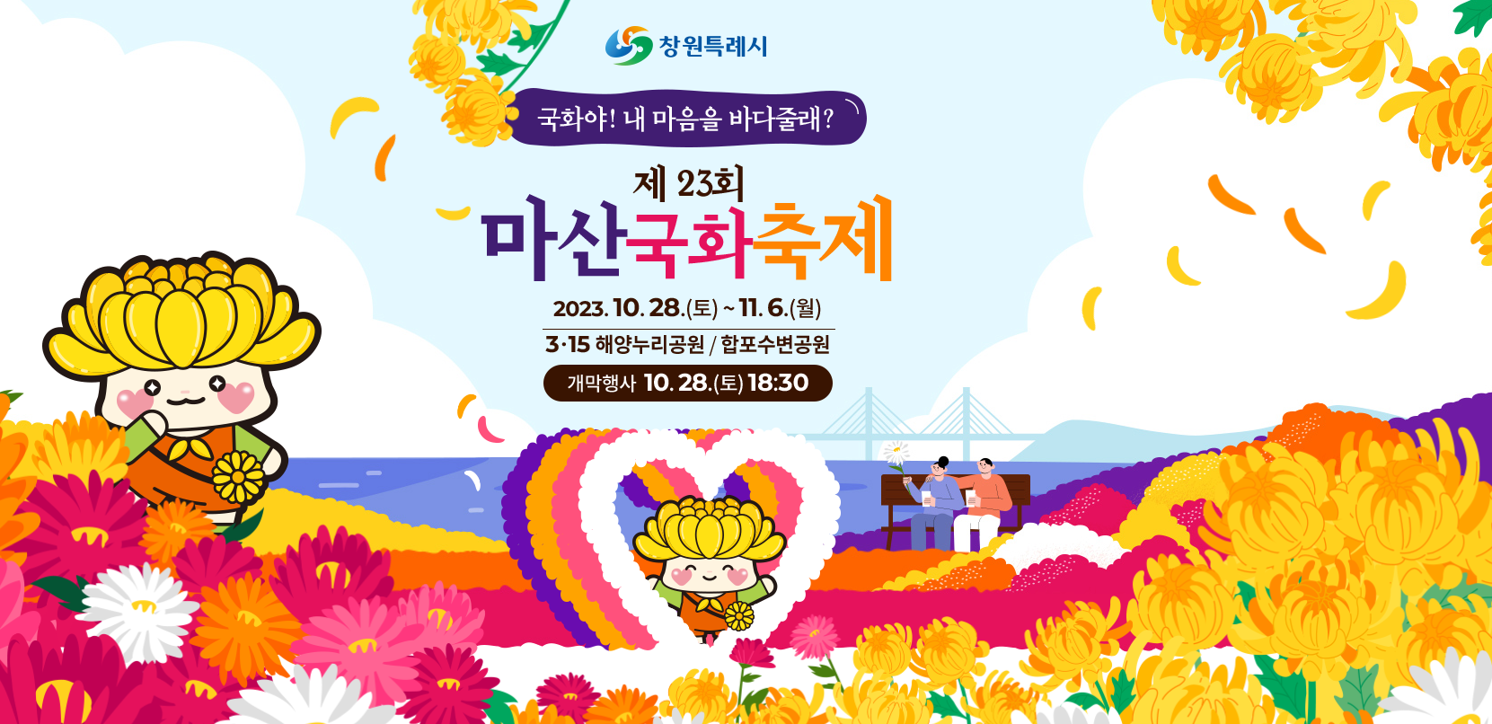 마산 국화축제 개막행사는 10.28(토) 18:30에 3.15 해양누리공원 및 합포수변공원 주변에서 행사를 진행합니다.