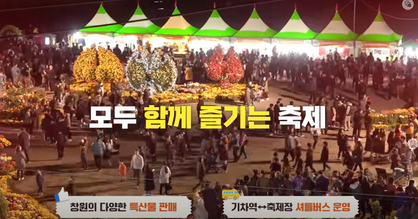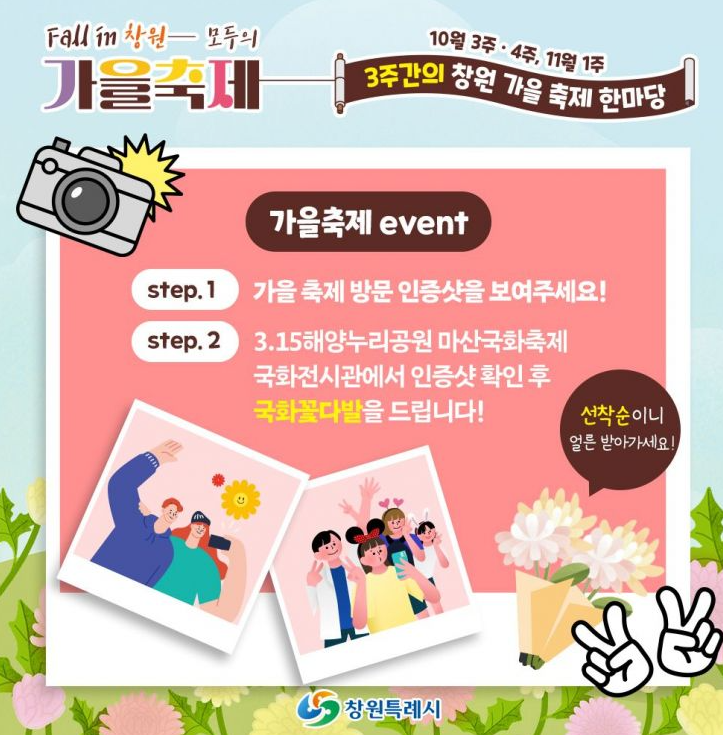 가을 축제를 맞이하여, 창원특례시에서는 창원 K-POP 월드페스티벌, 창원 거리예술축제, 문화 다양성 축제 MAM, 진해 가을 군항제, 근대 진해로의 여행을 주제로 축제가 열립니다. 축제장 들 중에서 한 곳 이상에서 찍은 방문 인증사진을 국화전시관 직원에게 보여주면, 다양한 모양, 빛깔, 향기가 매력적인 국화 꽃다발을 준다고 하니 이벤트에 꼭 참여하여 꽃다발을 받으면 좋을 것 같습니다.