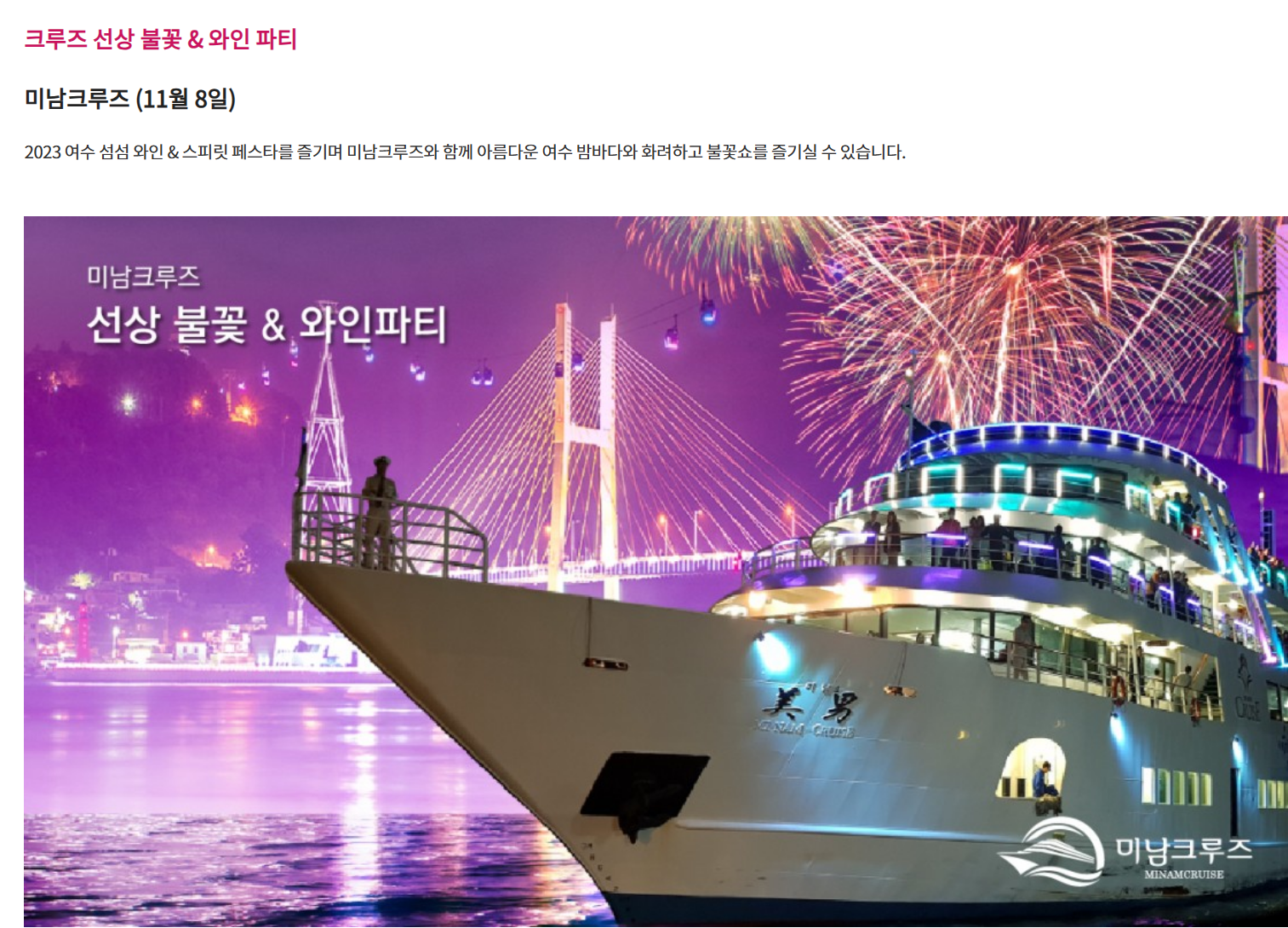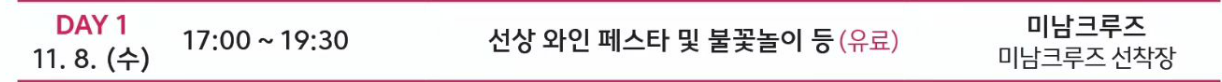 행사 첫날인 11월 8일 수요일에는 17:00-19:30 선상 와인 페스타 및 불꽃놀이가 미남크루즈에서 진행되게 됩니다. 이 행사는 유료행사입니다.