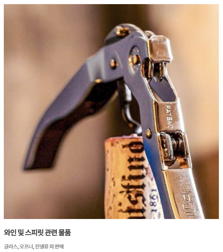 와인 및 스피릿 관련 물품 글라스, 오프나, 란넬류 등을 판매하게 됩니다.