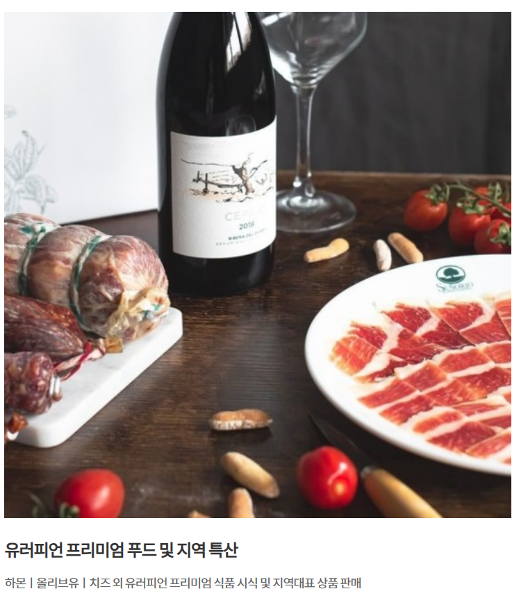 와인가 잘 어울리는 유러피언 프리미엄 푸드 및 지역특산품들을 만날 수 있습니다. 하몬, 올리브유, 치즈 외 유러피언 프리미엄 식품 시식 및 지역대표 상품을 판매하게 됩니다.