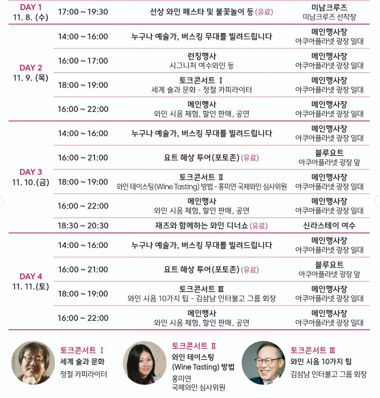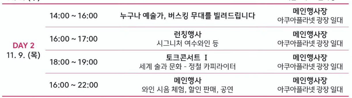 행사 둘째 날인 11월 9일 목요일에는 메인행사장 아쿠아플라넷 광장 일대에서 예술가 버스킹 무대가 있습니다. 또한 시그니처 여수와인의 론칭행사가 진행되며 세계 술과 문화에 대해 정철 카피라이터님의 토크콘서트가 진행됩니다. 또한 와인 시음 체험, 할인 판매, 공연이 진행되게 됩니다.