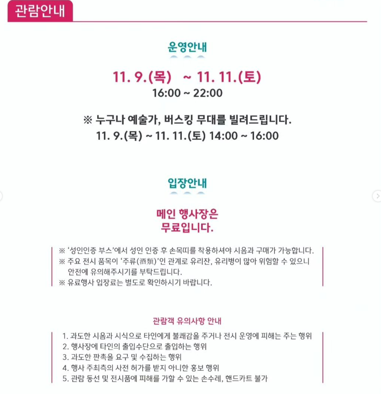 누구나 예술가, 버스킹 무대를 빌려줍니다. 메인 행사장은 무료입니다. 하지만 '성인인증 부스'에서 성인 인증 후 손목띠를 착용하여야 시음과 구매가 가능합니다. 주요 전시품이 주류이기 때문에 유리잔, 유리병이 많아 위험할 수 있으니 안전에 유의해야 합니다. 또한 과도한 시음과 시식으로 인해 타인에게 불쾌감을 주거나 전시 운영에 피해 주는 행위나 행사장에 타인의 출입수단으로 출입하거나 과도한 판촉을 요구 및 수집하거나, 행사 주최 측의 사전 허가를 받지 아니한 홍보행위, 관람동선 및 전시품에 피해를 가할 수 있는 손수레, 핸드카트는 출입이 불가합니다.