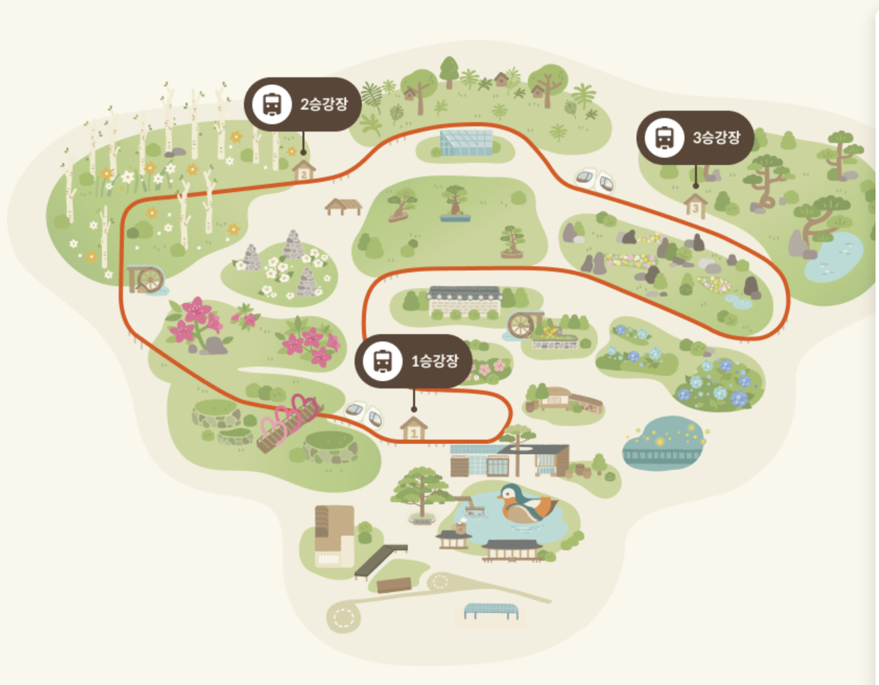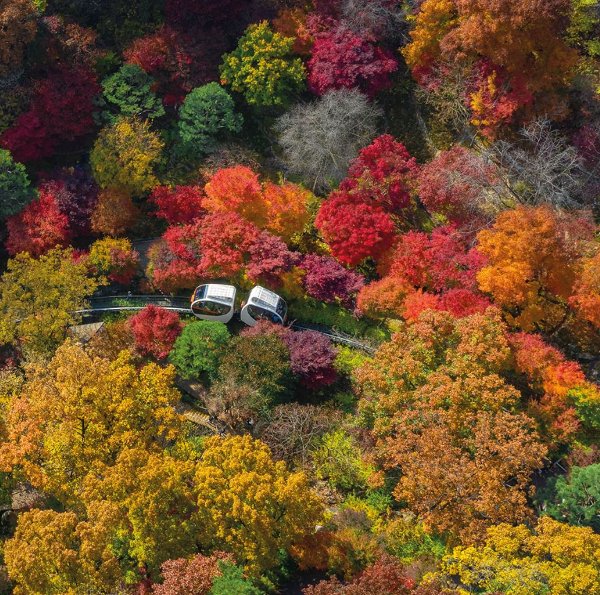 화담숲 가을단풍축제 모노레일은 1,2,3 승강장으로 이루어져 있습니다. 노약자의 편리하고 안전한 관람을 위해 화담숲 서쪽 이끼원 입구-화담숲정상-분재원 사이를 지나는 1,213m를 순환선입니다. 전체 운행 소요시간은 약 20분입니다.