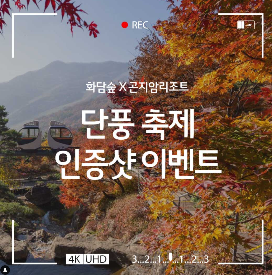 인스타그램에 화담숲과 곤지암리조트와 함께하는 인증샷 이벤트가 있습니다. 10.21(토)-11.21(일) 화담숲 또는 곤지암 리조트에서 촬영한 인증샷과  시물에 참여완료 댓글을 달면 1등은 디럭스 객실 1박, 2등은 곤지암향기 디퓨저, 3등은 화담숲 굿즈모음을 준다고 합니다.