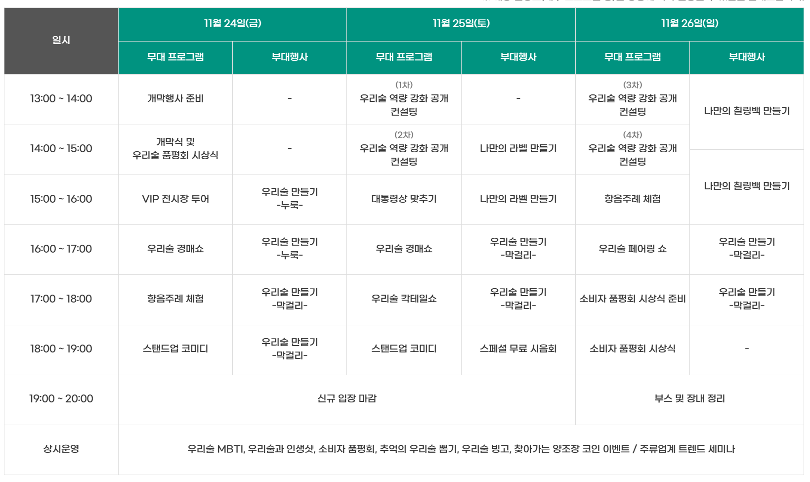 대한민국 우리 술대축제 프로그램은 13:00-20:00까지 진행이 됩니다. 일자별로 다양한 무대 프로그램과 부대 행사가 진행됩니다.