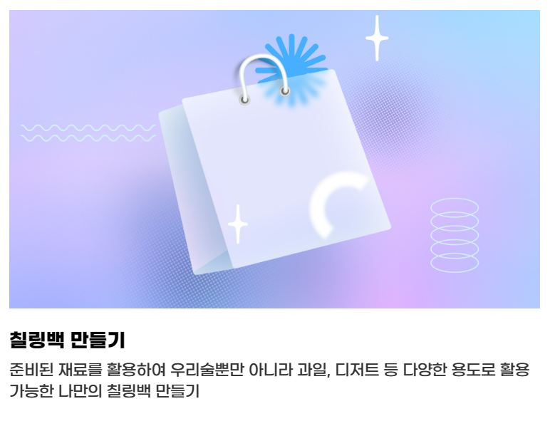 준비된 재료를 활용하여 우리 술뿐만 아니라 과일, 디저트 등 다양한 용도로 활용가능한 나만의 칠링백을 만들 수 있습니다.