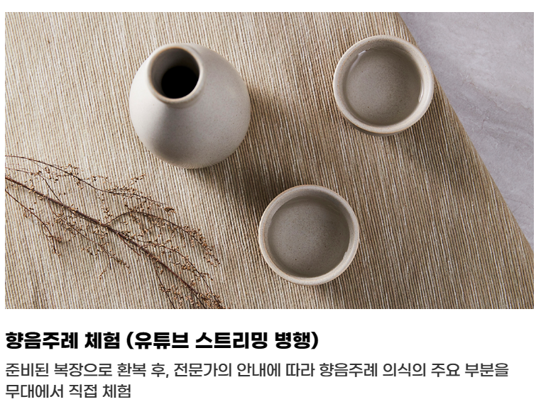 향음주례 체험을 (유튜브 스트리밍 병행) 진행합니다. 준비된 복장으로 환복 후, 전문가의 안내에 따라 향음주례 의식의 주요 부분을 무대에서 직접 체험할 수 있습니다.