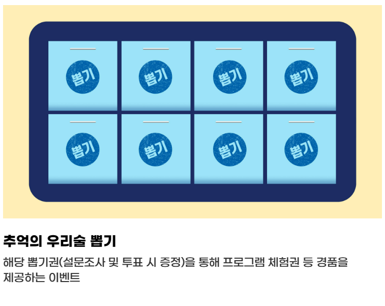 설문조사 와 투표 시 증정되는 뽑기권을 가지고 프로그램 체험권 및 경품을 뽑을 수 있는 이벤트가 준비되어 있습니다.
