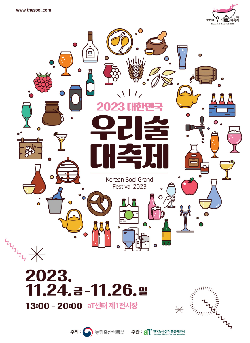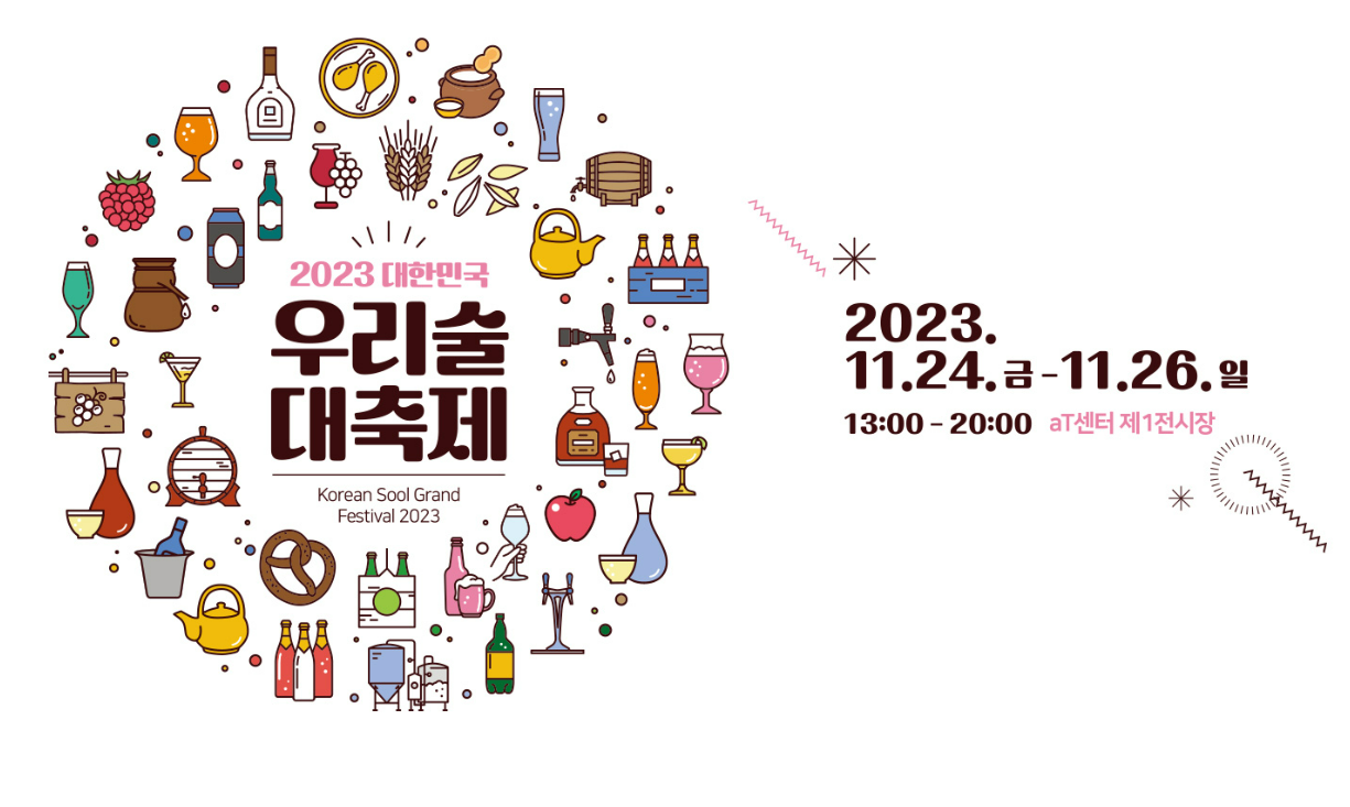 대한민국 우리 술 대축제 일정은 2023.11.24(금)-2023.11.26(일) 시간은 13:00-20:00입니다.