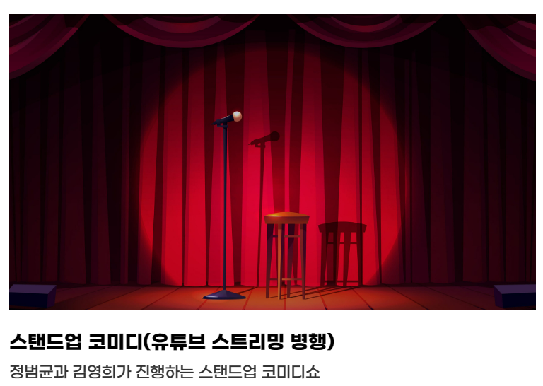 개그맨 정범균과 김영희가 진행하는 스탠드업 코미디쇼가 진행됩니다. 개그맨 김영희 님은 두 분 토론에서 아줌마 연기를 찰떡깥이 소화해 내서 많은 분들에게 사랑을 받은 분입니다. 개그맨 정범균 님은 유재석 님과 닮은꼴 개그맨으로 유명한 분입니다.
