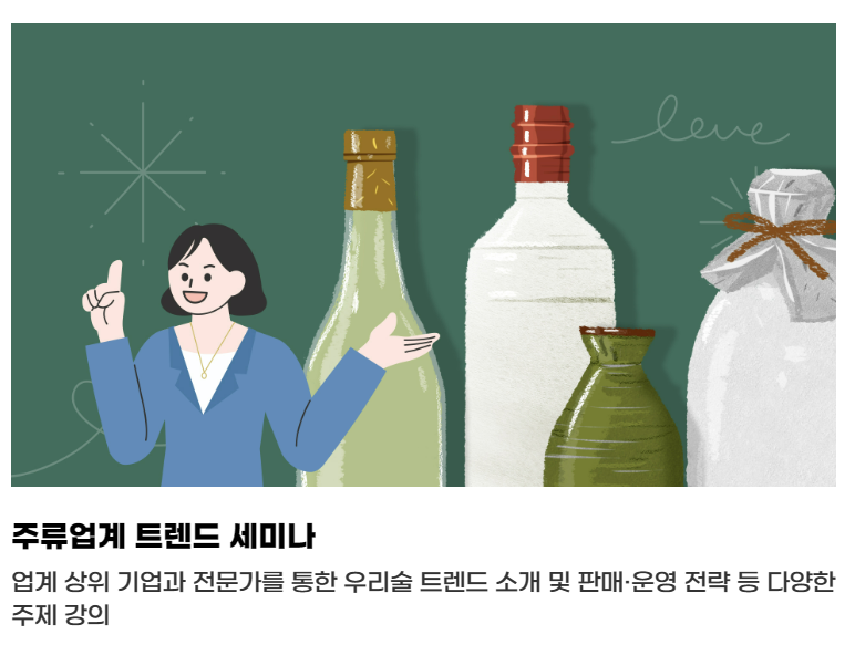 주류업계 트렌드 세미나로 업계 상위 기업과 전문가를 통한 우리술 트렌드 소개 및 판매, 운영, 전략등 다양한 주례를 강의합니다.