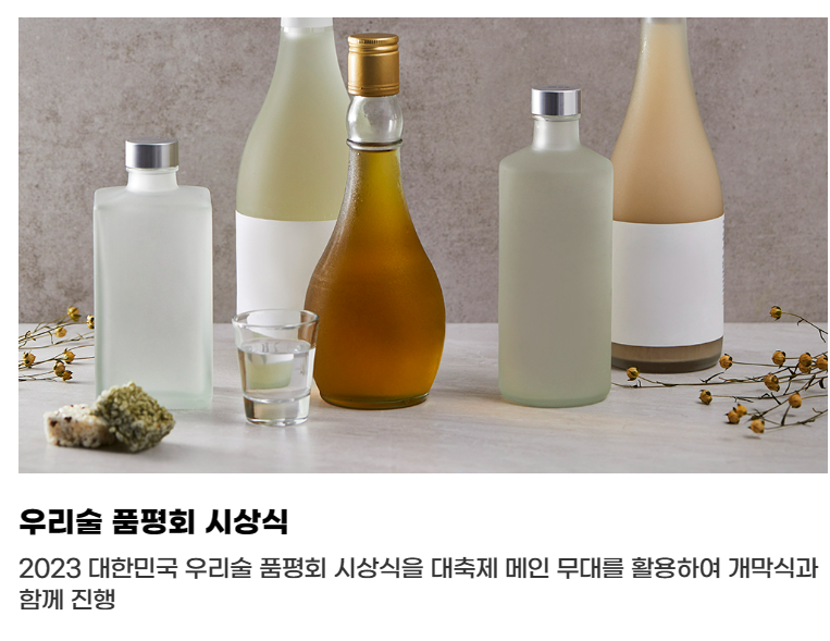 2023 대한민국 우리술 품평회 시상식을 대축제 메인 무대를 활용하여 개막식과 함께 진행될 예정입니다.