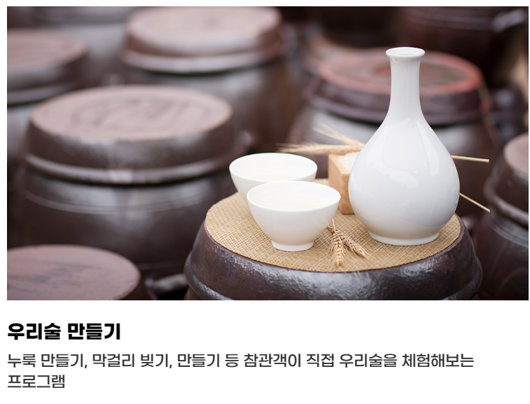 참관객이 직접 누룩 만들기, 막걸리 빛기, 만들기를 하여 직접 우리 술을 만들어 볼 수 있습니다.