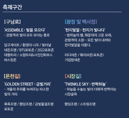 행사내용은 미디어 아트 작가들의 빛 시설물 전시, 조형물 포토존이 준비되어 있습니다. 또한 시민참여 프로그램과 크리스마스 공연이 준비되어 있습니다.