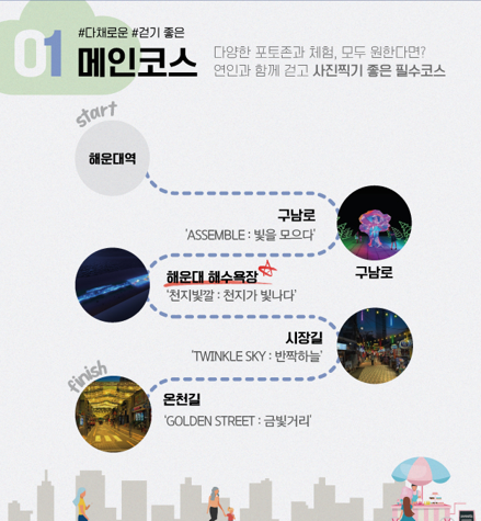 메인코스는 다양한 보존과 체험으로 연인과 함께 걷고 사진 찍기 좋은 필수코스입니다. 해운대역을 시작으로 구남로 'ASSEMBLE : 빛을 모으다', 해운대 해수욕장 '천지빛깔 : 천지가 빛나다', 시장길 'TWINKLE SKY : 반짝 하늘', 온천길 'GOLDEN STREET : 금빛거리'로 이루어져 있습니다.