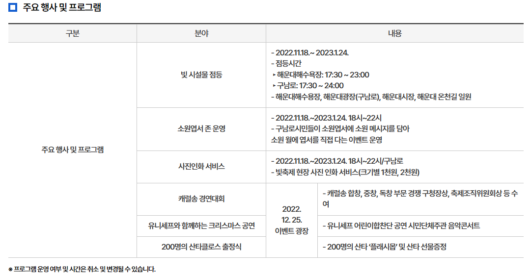 2023.12.02-2024.01.31 제10회 해운대 빛축제 일정입니다.