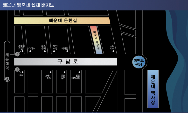 해운대 빛축제 배치도입니다. 해운대 백사장과, 해운대 온천길, 그리고 구남로에서 빛축제가 열립니다.