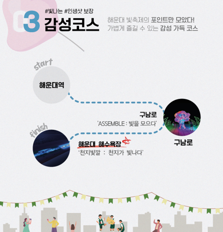 세 번째는 감성코스로 해운대 빛축제의 포인트만 모아서, 가볍게 즐길 수 있습니다. 해운대역, 구남로, 해운대 해수욕장순으로 돌면 빠르게 구경할 수 있습니다.